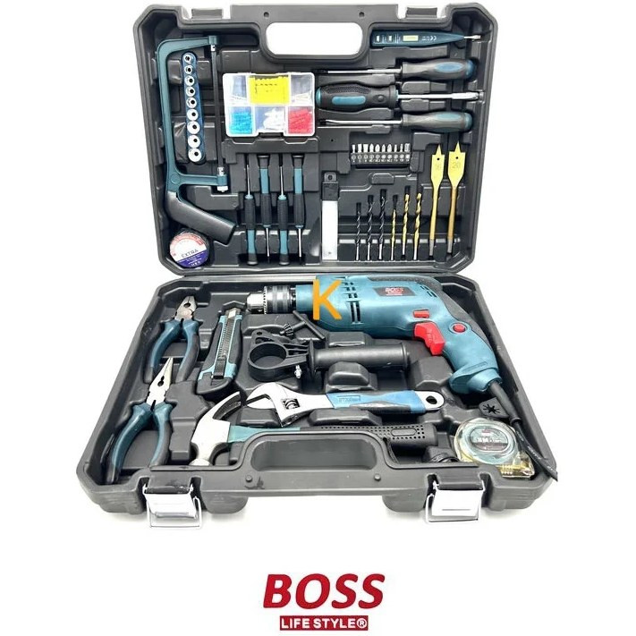 11 عدد پیچ گوشتی سر دریلی، 4 عدد پیچ گوشتی الکترونیکی، یک بسته تیغ موکت بر، پیچ گوشتی چهار سو، جعبه پیچ و رول پلاک، پیچ گوشتی دو سو، پیچ گوشتی بکس، 3 عدد مته الماس، 3 عدد مته آهن، فازمتر دیجیتال، دسته کمکی، ۹ عدد بکس، آچار فرانسه، متر 3 متری، چسب برق، اره آهن بر، انبردست، دم باریک، چکش، دفتر چه راهنما